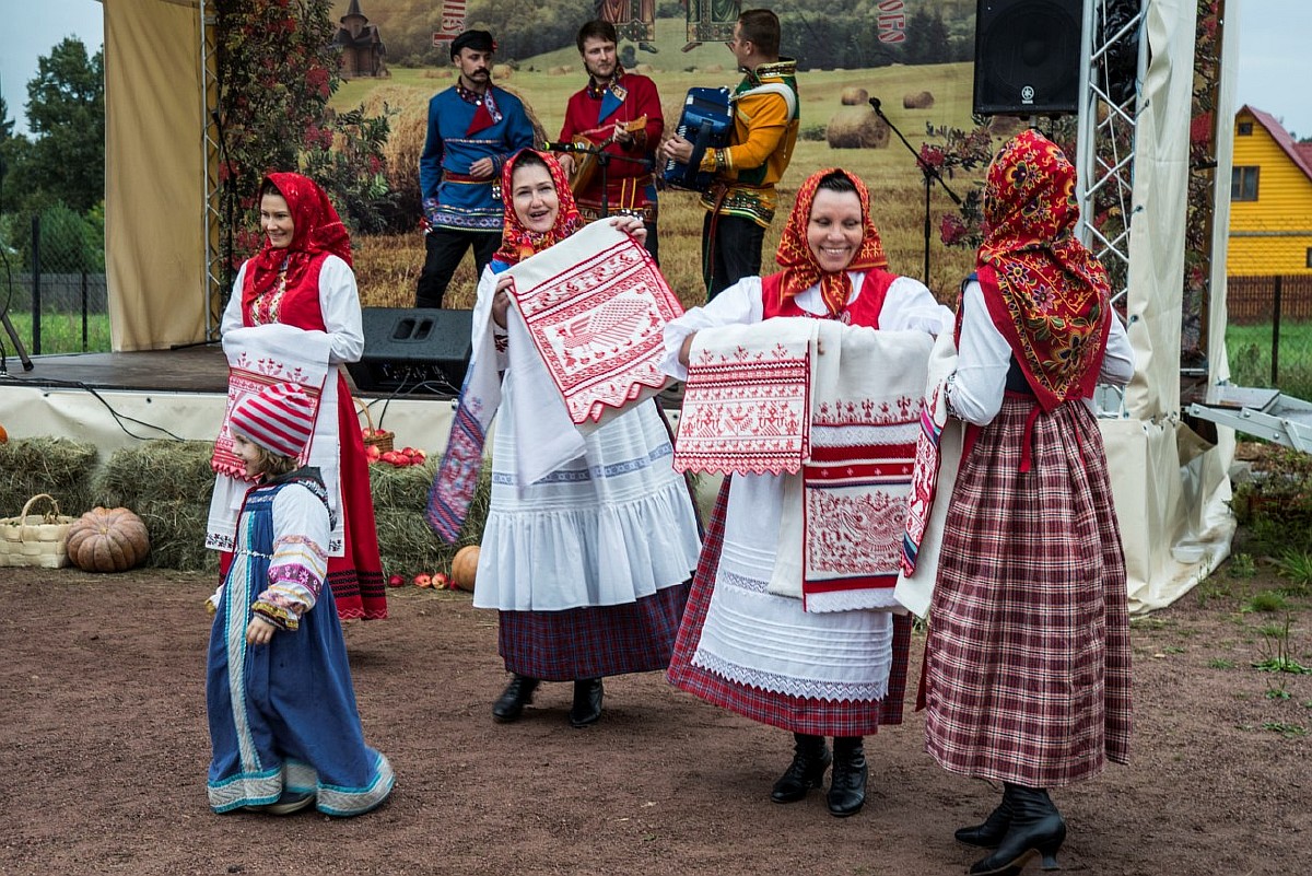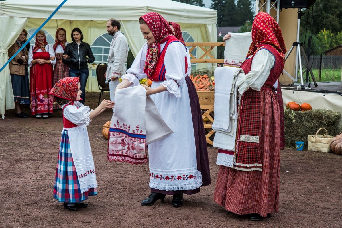 Наши друзья — студия традиционного костюма «Русские начала» во главе с Татьяной Вальковой — уже во второй раз организовали показ уникальной коллекции русских народных костюмов различных эпох. Под праздничные пасхальные песнопения было продемонстрировано девять платьев ручной работы Московской Руси, созданных по старинным русским технологиям XVII века. Под балалайку и баян была показана коллекция традиционного крестьянского костюма северной Руси, украшенного вышивкой по льняному полотну. Всех поразили и вышитые рушники. Руководитель студии Татьяна Валькова пригласила и нас в свою мастерскую учиться своими руками творить такую красоту.